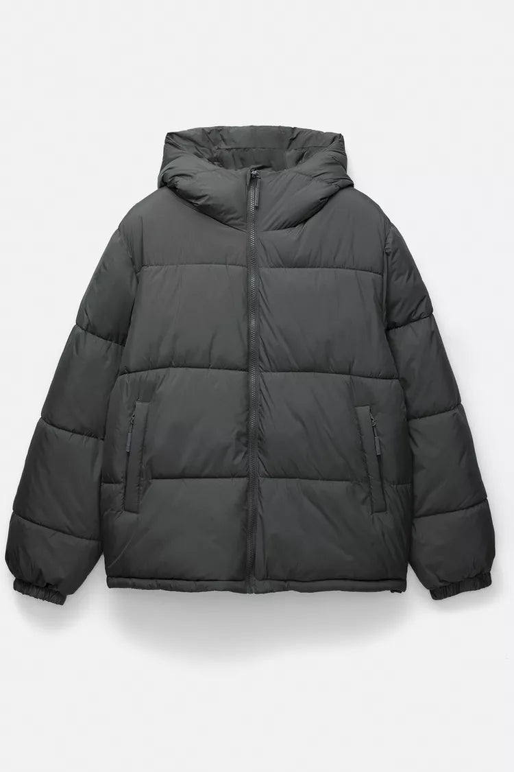 Padded jacket with hood, zip fastening, and long sleeve.